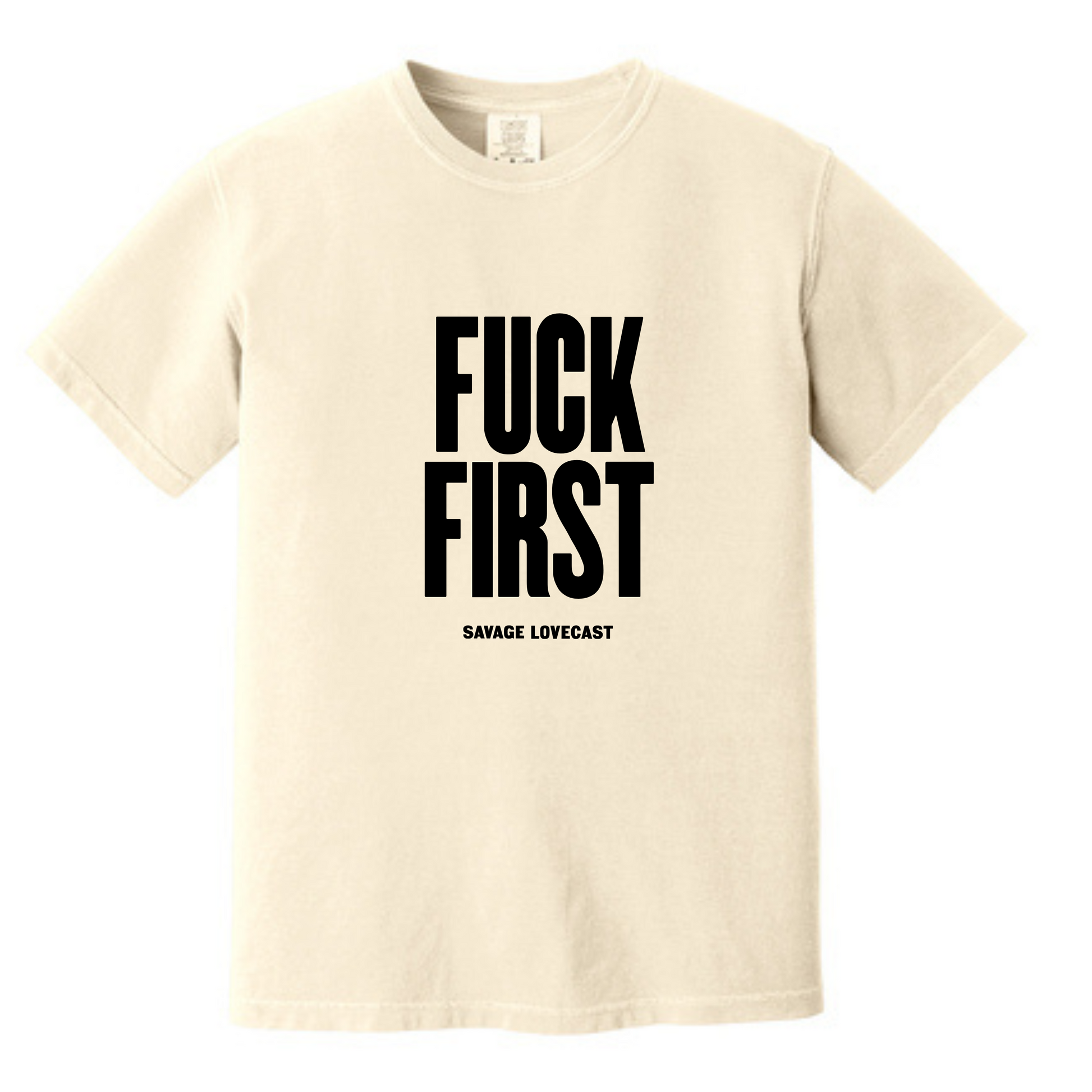 Fuck First graphic on Natural Comfort Colors t-shirt.